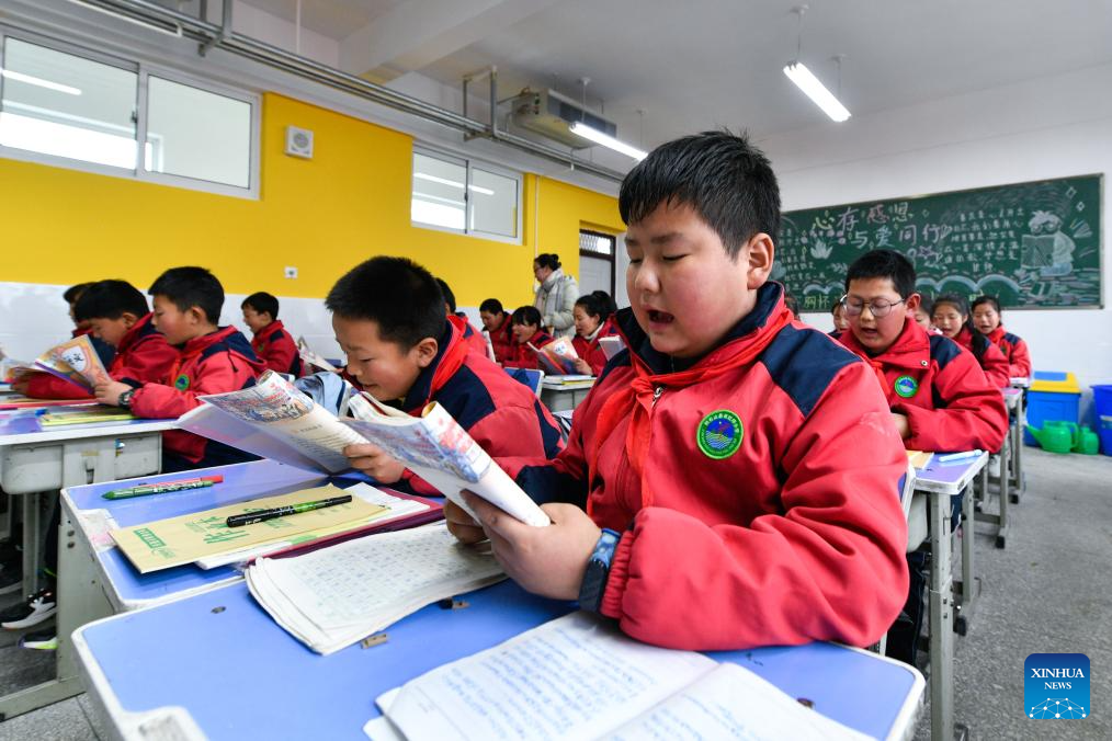 Students read at Xiaohongping Primary School in Shiyuan Town of Jishishan County, northwest China's Gansu Province, Feb. 26, 2024. Primary and secondary schools in Jishishan started new semester on Monday.