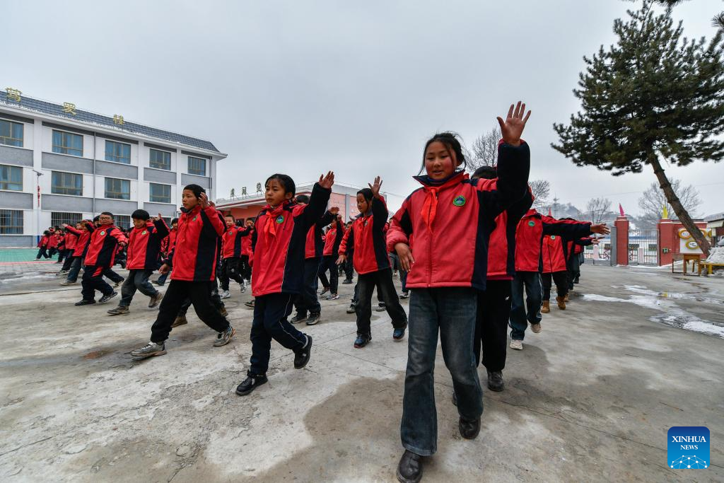 Students take exercise at Xiaohongping Primary School in Shiyuan Town of Jishishan County, northwest China's Gansu Province, Feb. 26, 2024. Primary and secondary schools in Jishishan started new semester on Monday.