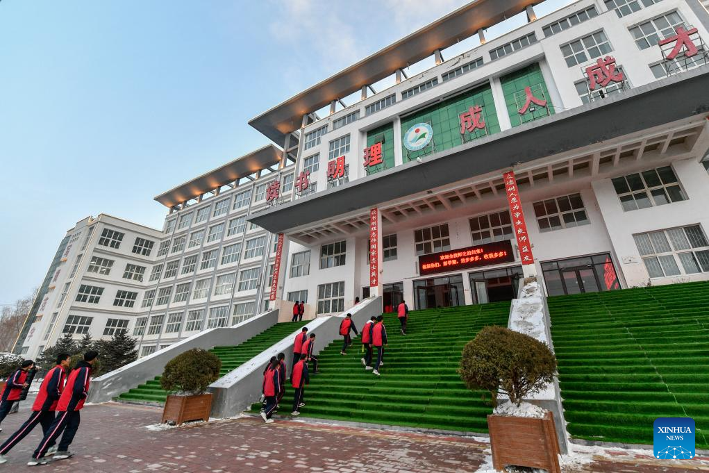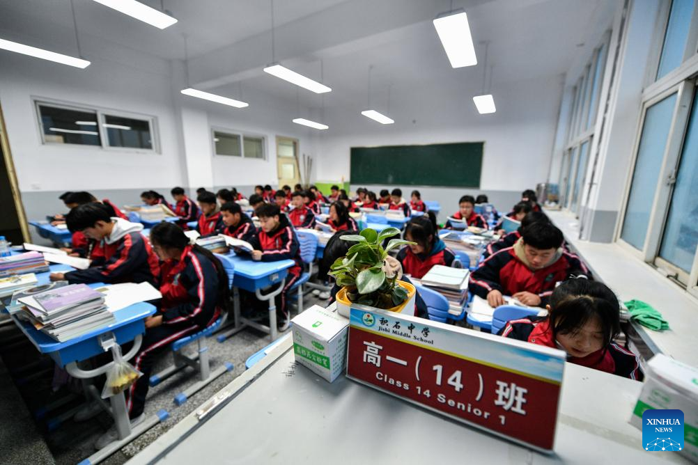 Students study at Jishi Middle School in Jishishan County, northwest China's Gansu Province, Feb. 26, 2024. Primary and secondary schools in Jishishan started new semester on Monday.