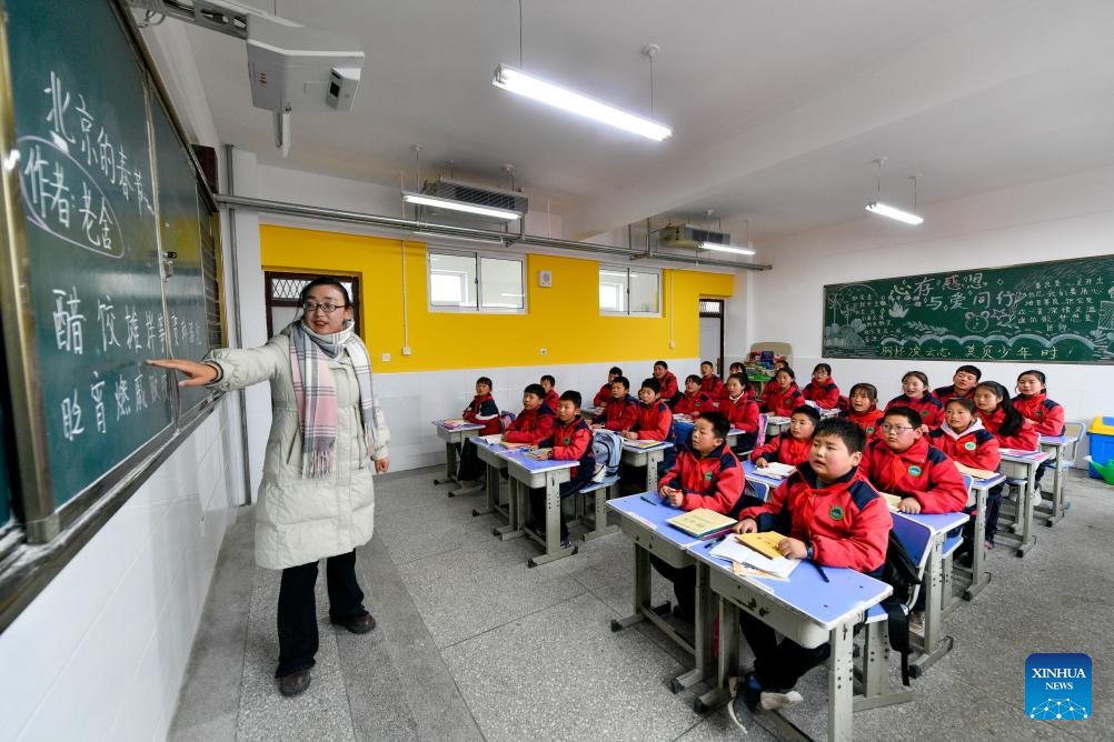 A teacher instructs students at Xiaohongping Primary School in Shiyuan Town of Jishishan County, northwest China's Gansu Province, Feb. 26, 2024. Primary and secondary schools in Jishishan started new semester on Monday.