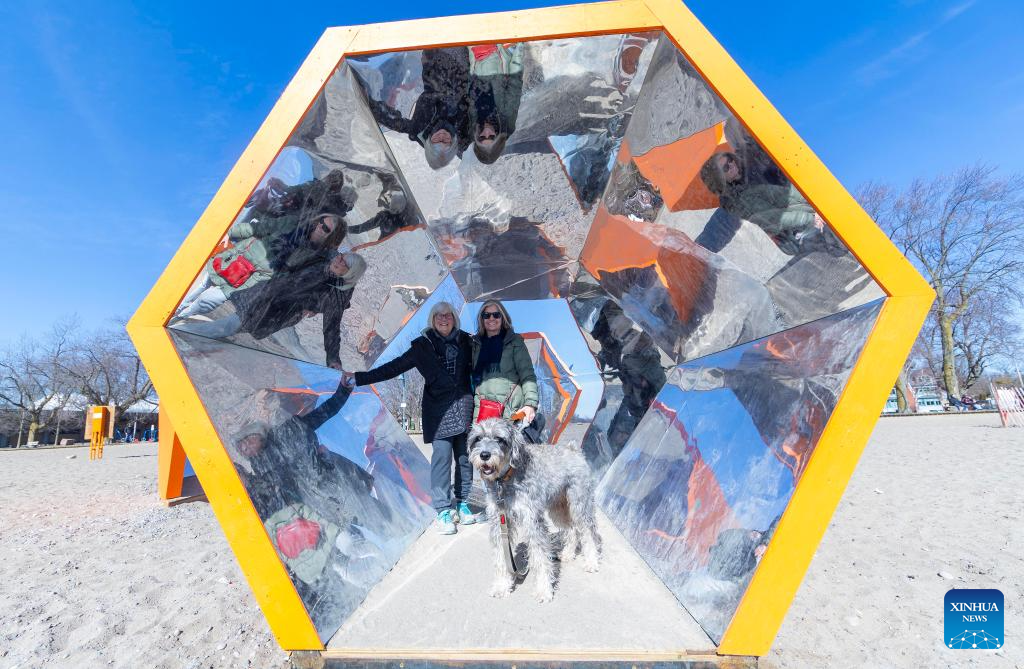 People and a dog pose for photos with the art installation "A Kaleidoscopic Odyssey" at the public exhibition of the 2024 Winter Stations international design competition in Toronto, Canada, on Feb. 26, 2024. Winter Stations is a single-stage international design competition held annually in Toronto. (Photo by Zou Zheng/Xinhua)