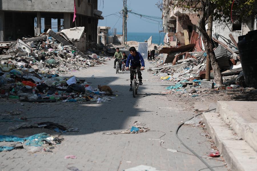 Children ride past destroyed buildings in Gaza City, Feb. 26, 2024. (Photo by Malik Atallah/Xinhua)