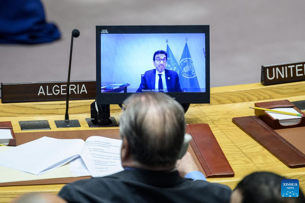 Maurizio Martina (on screen), deputy director-general of the Food and Agriculture Organization of the United Nations (UN), addresses the Security Council during a meeting on the protection of civilians in armed conflicts, held at the UN headquarters in New York, on Feb. 27, 2024. (Loey Felipe/UN Photo/Handout via Xinhua)