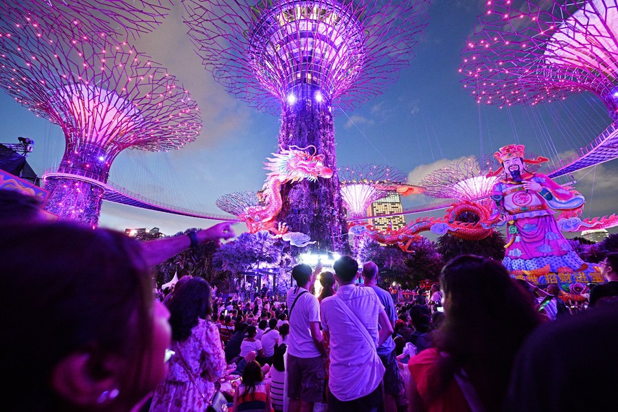 Tourists view the lanterns during the light up ceremony of the "River Hongbao", an integral part of the Lunar New Year celebrations here, at Singapore's Gardens by the Bay, Feb. 8, 2024. (Photo by Then Chih Wey/Xinhua)