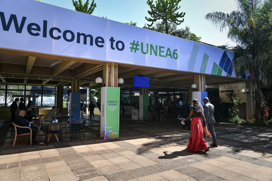 People walk towards the venue of the sixth session of the United Nations Environment Assembly (UNEA-6) in Nairobi, Kenya, Feb. 26, 2024. (Xinhua/Han Xu)