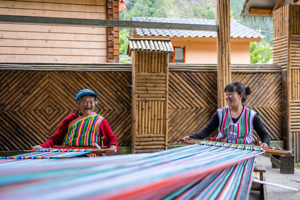 In Dizhengdang Village of Dulongjiang Township, located in the Nujiang Lisu Autonomous Prefecture, Li Wenshi, a woman in her 70s adorned with a distinctive indigo tattoo of her ethnic group on her face, is working tenaciously in a quaint courtyard. She skillfully weaves cloth for a traditional Drung blanket, with vibrant cotton threads swiftly transforming into fabric beneath her weathered hands, making the blanket unfold like a dazzling rainbow.