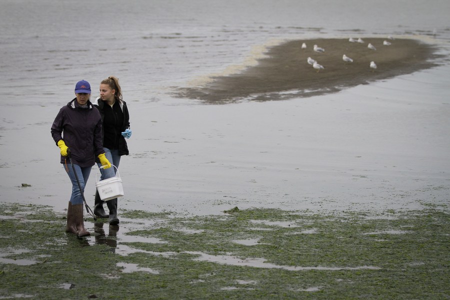Volunteers search for litters along the Iona Beach during the annual Great Canadian Shoreline Cleanup event in Vancouver, Canada, Sept. 21, 2019. (Photo by Liang Sen/Xinhua)