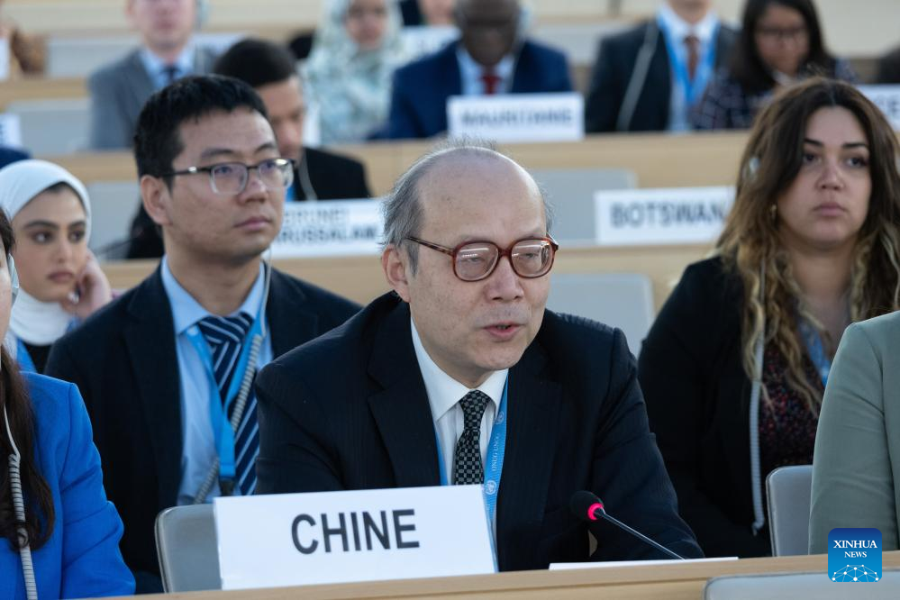 Chen Xu, permanent representative of China to the United Nations (UN) Office in Geneva and other international organizations in Switzerland, speaks during the 55th session of the UN Human Rights Council in Geneva, Switzerland, Feb. 29, 2024. As the Gaza Strip is facing an unparalleled humanitarian crisis, an immediate ceasefire is the urgent demand of the global community and a fundamental necessity for achieving peace, Chen said while elaborating on China's position on the situation between Palestine and Israel at the 55th session of the UN Human Rights Council. (Xinhua/Shi Song)