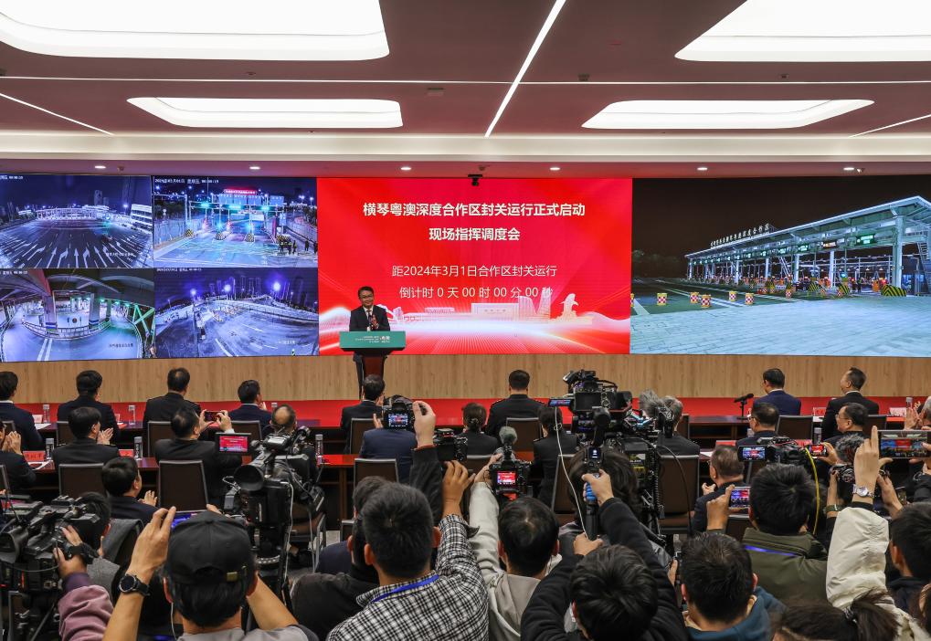 This photo taken on March 1, 2024 shows the launching ceremony for new customs operation in the Guangdong-Macao In-depth Cooperation Zone in Hengqin of Zhuhai, south China's Guangdong Province. (Xinhua/Liu Dawei)