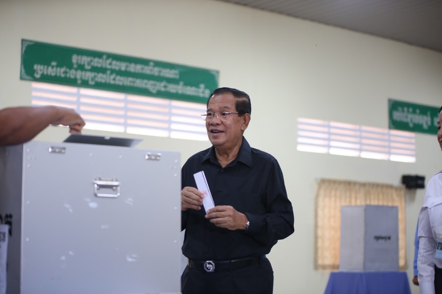 Former Cambodian Prime Minister Samdech Techo Hun Sen, president of the ruling Cambodian People's Party (CPP), casts his ballot during a Senate election in Kandal province, Cambodia, Feb. 25, 2024. (Photo by Ly Lay/Xinhua)