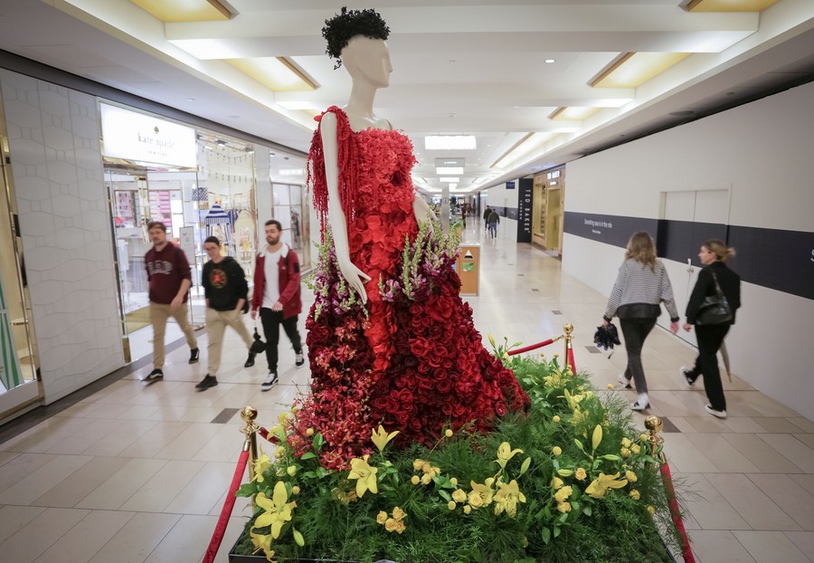 A mannequin decorated with flowers is displayed inside a shopping mall in Vancouver, British Columbia, Canada, on June 3, 2022. (Photo by Liang Sen/Xinhua)