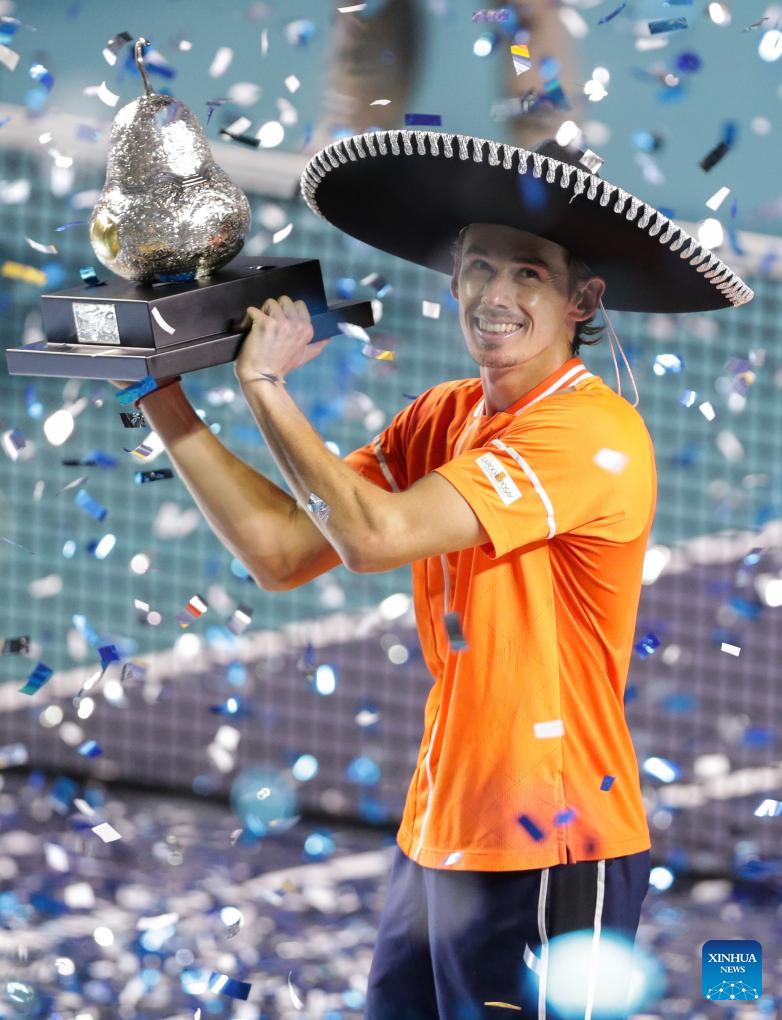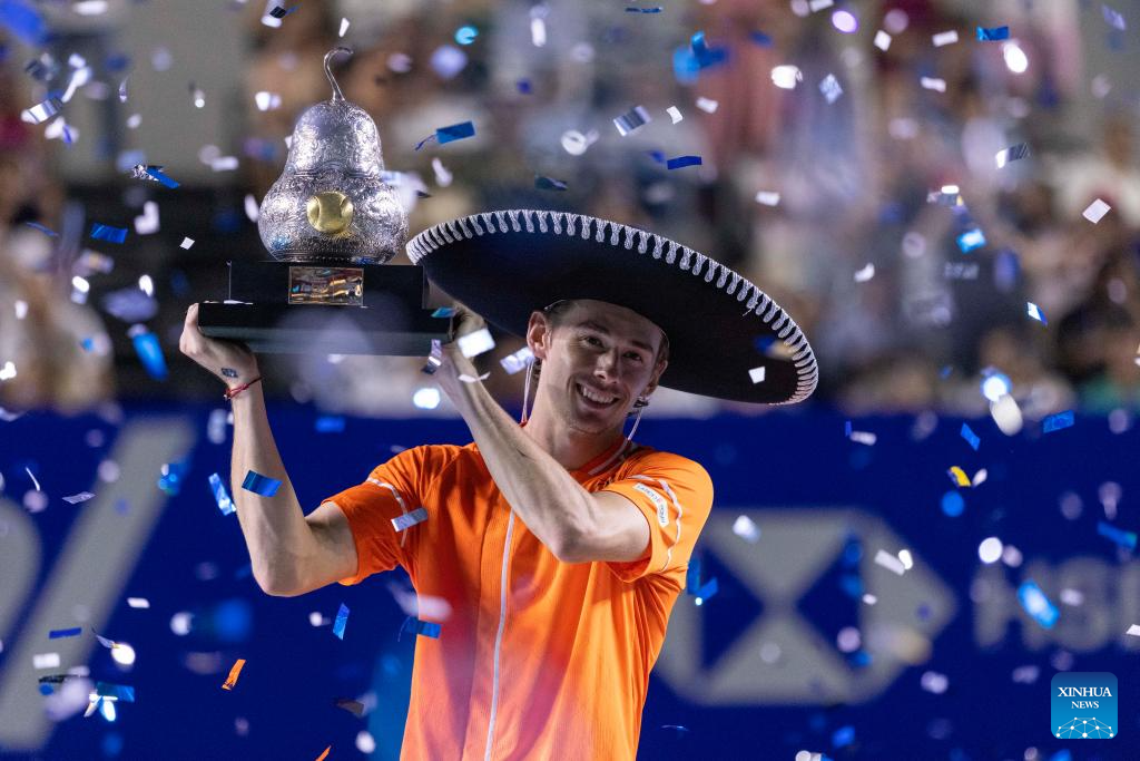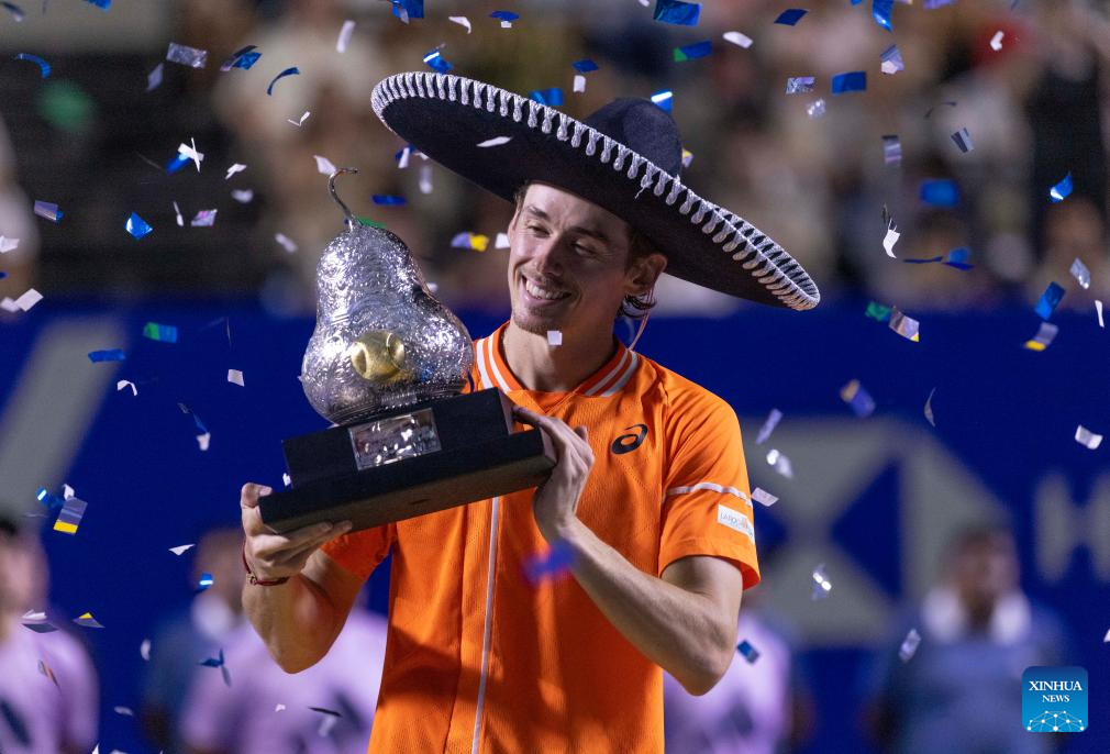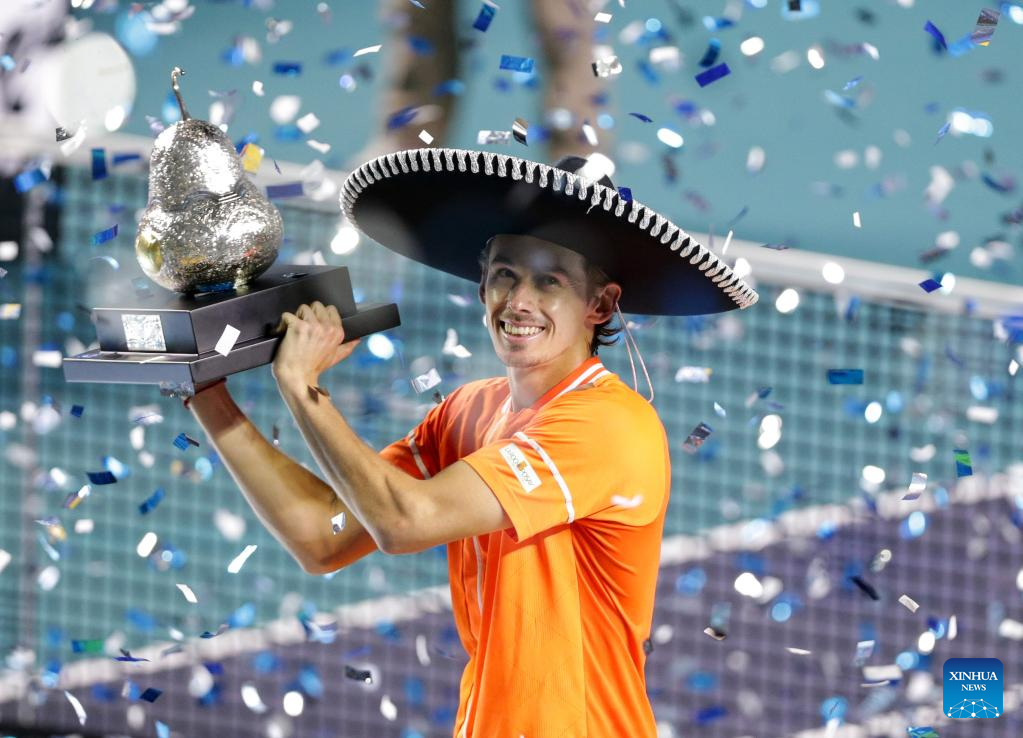 Champion Australia's Alex De Minaur celebrates during the awarding ceremony for the men's singles event at the 2024 ATP Mexican Open tennis tournament in Acapulco, Mexico, March 2, 2024. (Xinhua/Li Mengxin)