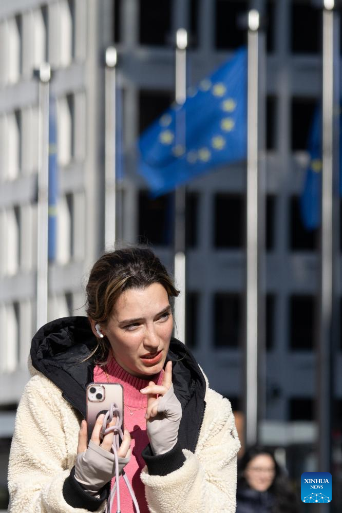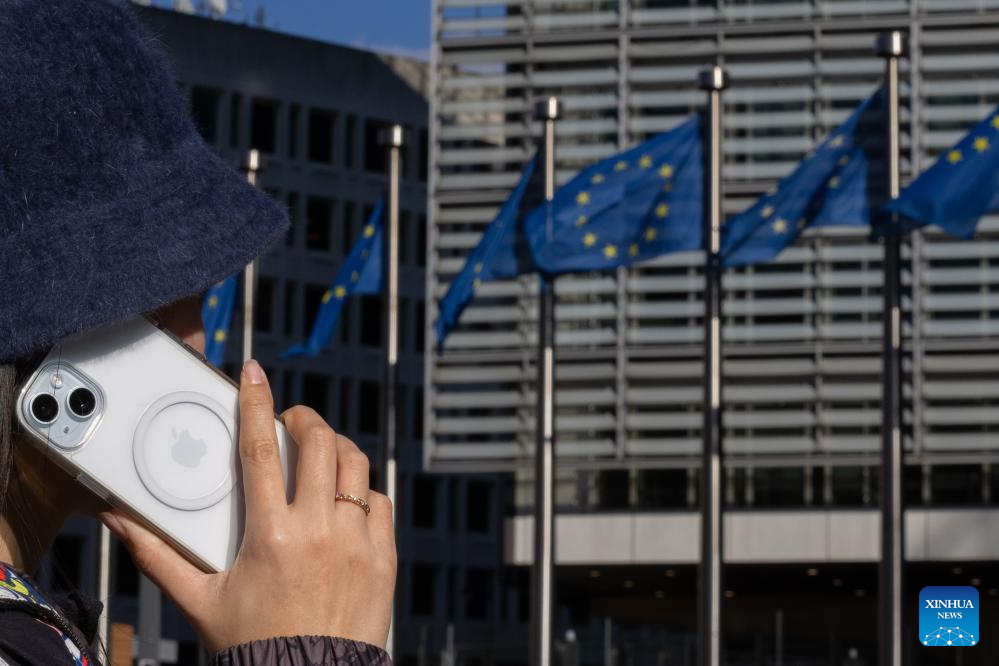 A woman talks through an iPhone at the Berlaymont building, headquarters of the European Commission, in Brussels, Belgium, on March 4, 2024. The European Union (EU) on Monday slapped tech giant Apple with over 1.8 billion euros (about 1.95 billion U.S. dollars) in fines for alleged antitrust violations. (Xinhua/Meng Dingbo)