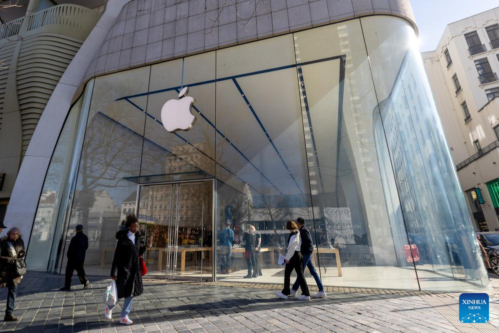 This photo taken on March 4, 2024 shows an Apple Store in Brussels, Belgium. The European Union (EU) on Monday slapped tech giant Apple with over 1.8 billion euros (about 1.95 billion U.S. dollars) in fines for alleged antitrust violations. (Xinhua/Meng Dingbo)