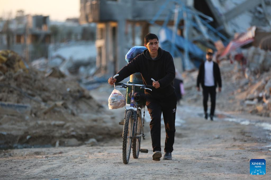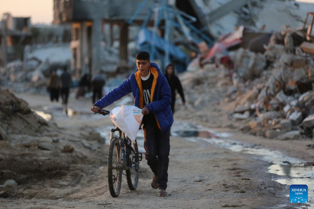 A man pushes a bicycle at Al-Maghazi refugee camp in central Gaza Strip, on March 5, 2024. The Palestinian death toll in the Gaza Strip from ongoing Israeli attacks has risen to 30,631, the Hamas-run Health Ministry said on Tuesday. (Xinhua)
