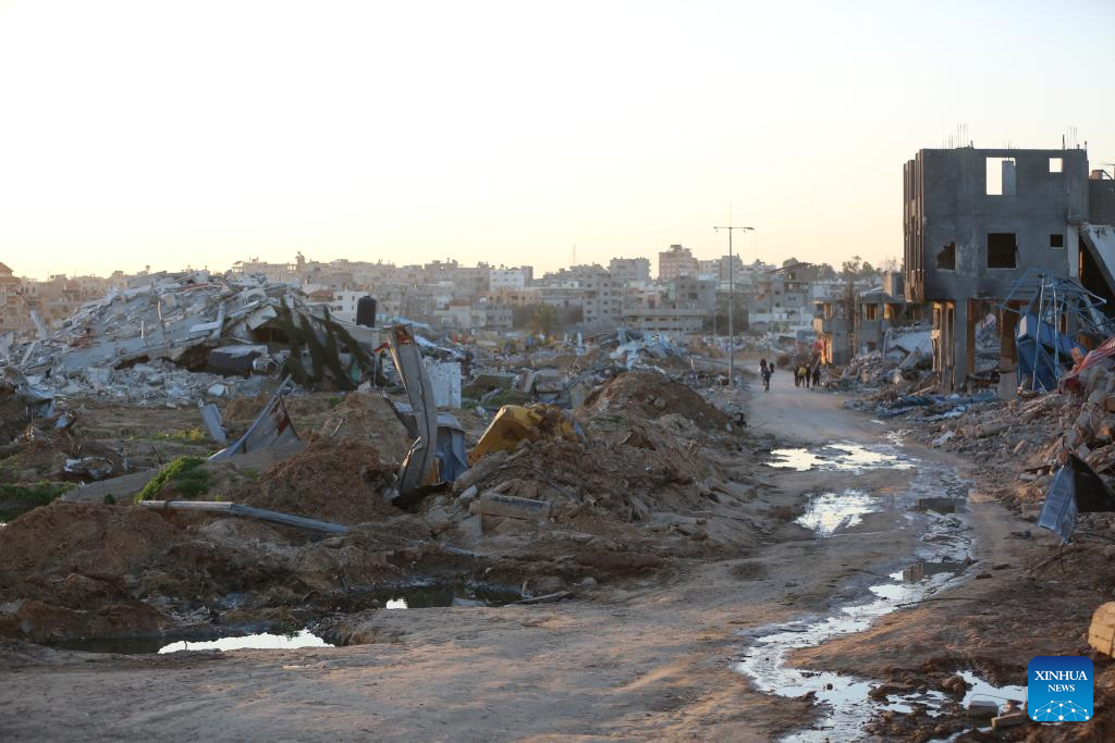 People walk past destroyed buildings at Al-Maghazi refugee camp in central Gaza Strip, on March 5, 2024. The Palestinian death toll in the Gaza Strip from ongoing Israeli attacks has risen to 30,631, the Hamas-run Health Ministry said on Tuesday. (Xinhua)