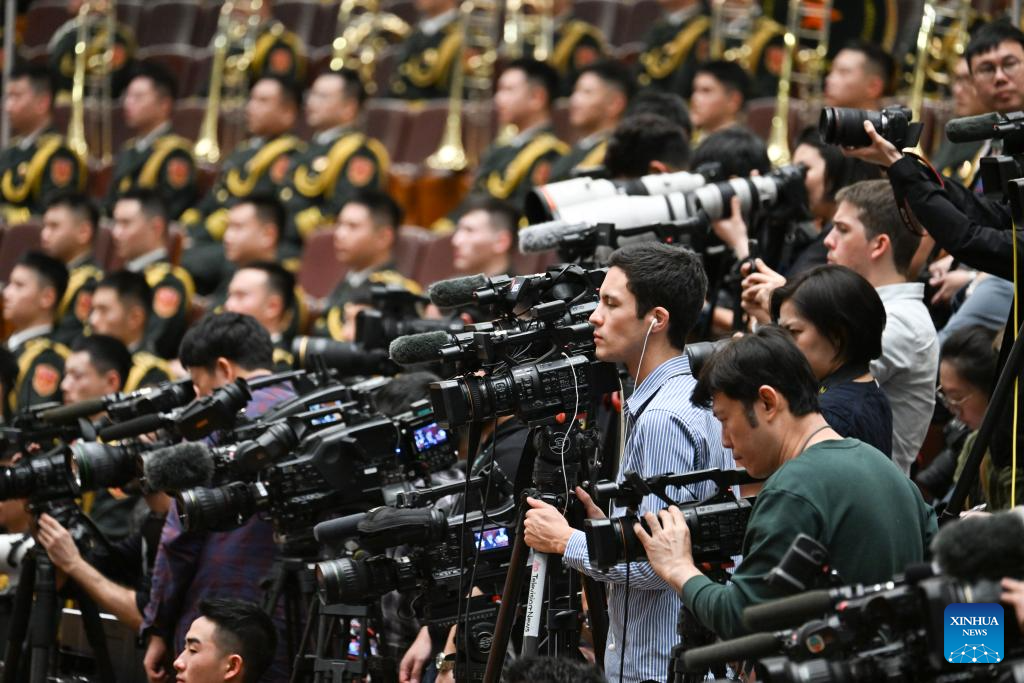 Journalists work at the opening meeting of the second session of the 14th National People's Congress (NPC) at the Great Hall of the People in Beijing, capital of China, March 5, 2024. (Xinhua/Mu Yu)