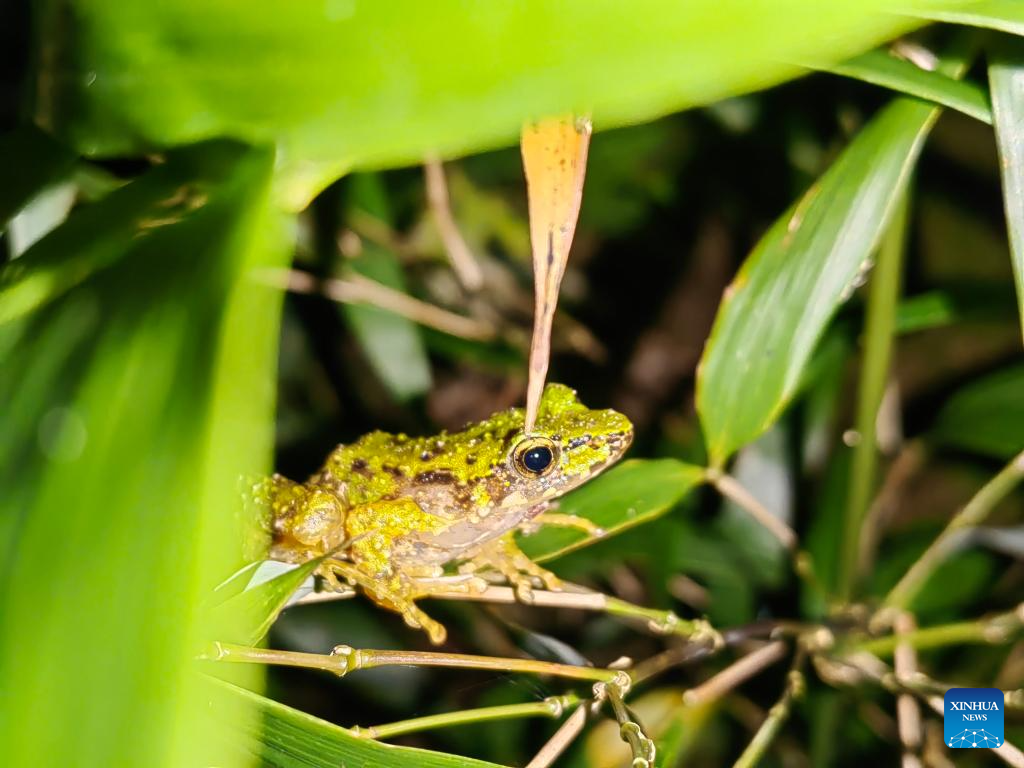 This photo taken on Sept. 1, 2023 shows a new species of odorous frog, the Odorrana leishanensis, at the Leigong Mountain National Nature Reserve in southwest China's Guizhou Province. (Xinhua)