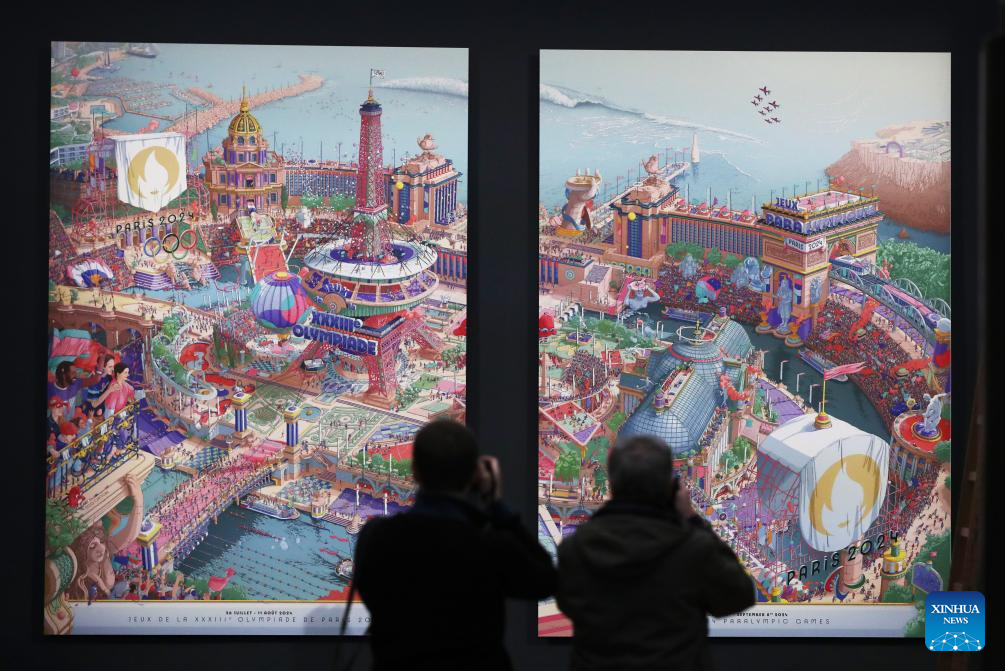 The official posters of Paris 2024 Olympic (L) and Paralympic Games are seen during the unveiling ceremony at the Orsay Museum in Paris, France, March 4, 2024. (Xinhua/Gao Jing)