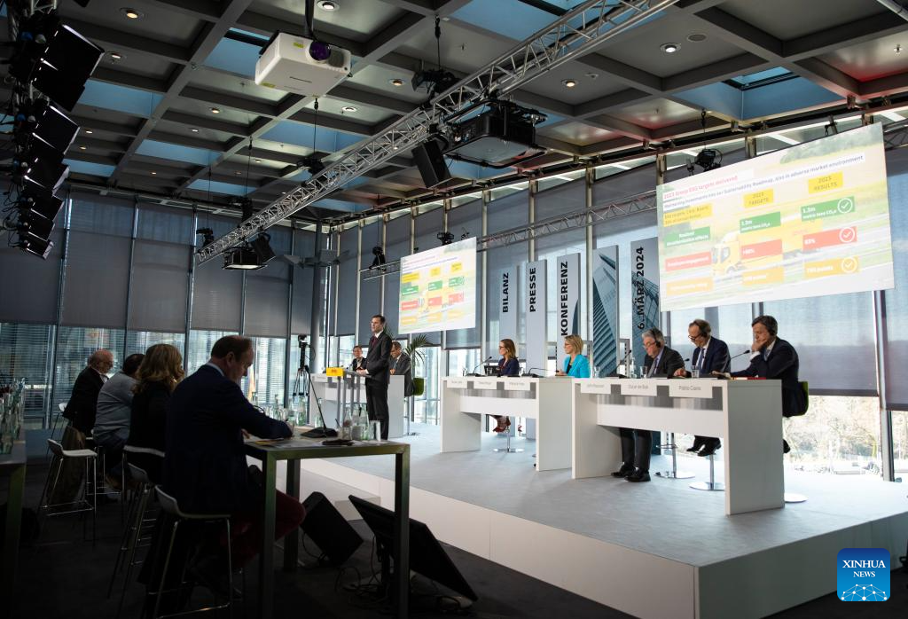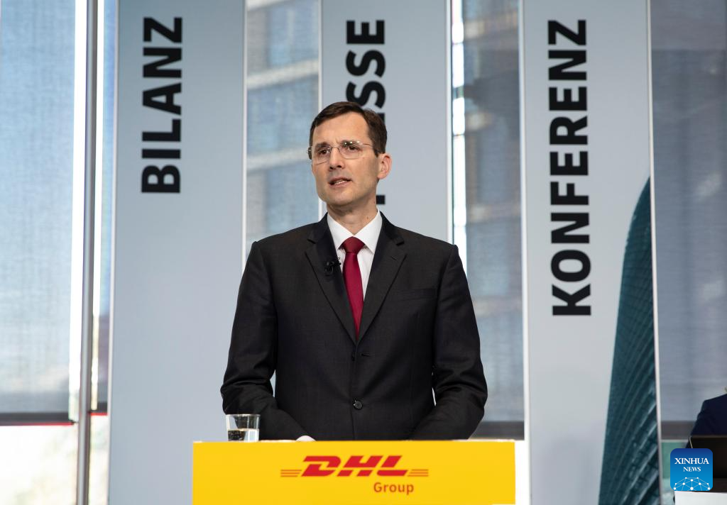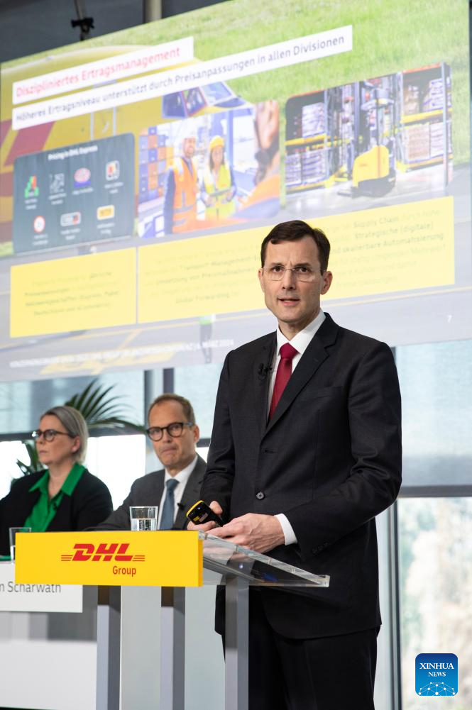 DHL CEO Tobias Meyer speaks at a press conference at DHL headquarters in Bonn, Germany, on March 6, 2024. The German logistics giant DHL Group recorded a revenue of 81.8 billion euros (89.1 billion U.S. dollars) and an operating result (EBIT) of 6.3 billion euros for the 2023 financial year, meeting the company's target, according to the firm's annual report released Wednesday. (Xinhua/Zhang Fan)
