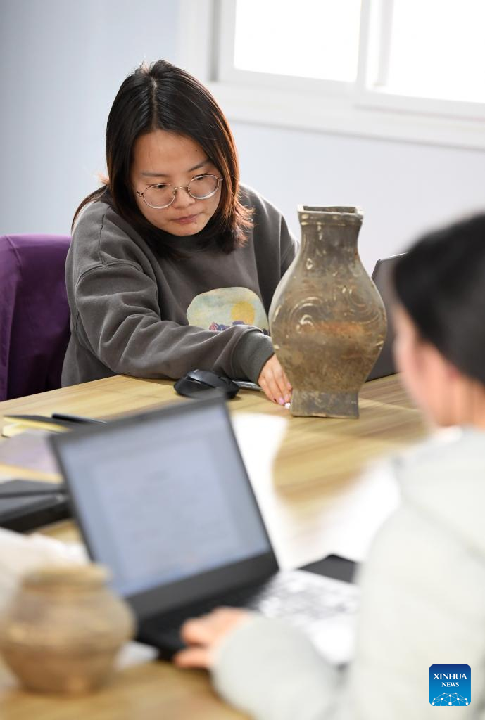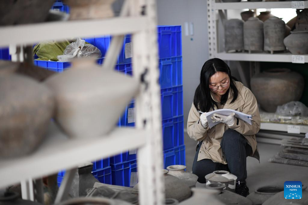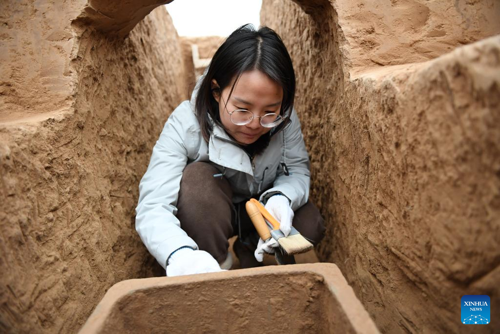 Zhu Yingpei, the team leader of an archaeological team from the Shaanxi Academy of Archaeology, documents findings in Xianyang in northwest China's Shaanxi Province, March 5, 2024. (Xinhua/Li Yibo)