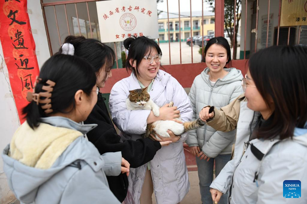 Female archaeologists of an archaeological team from the Shaanxi Academy of Archaeology, play with a cat as they take break during work in Xianyang in northwest China's Shaanxi Province, March 5, 2024. (Xinhua/Li Yibo)