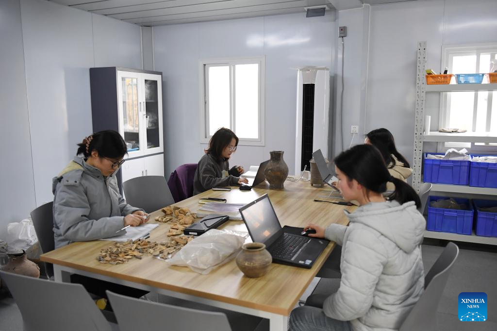 Female archaeologists of an archaeological team from the Shaanxi Academy of Archaeology document findings in Xianyang in northwest China's Shaanxi Province, March 5, 2024. (Xinhua/Li Yibo)