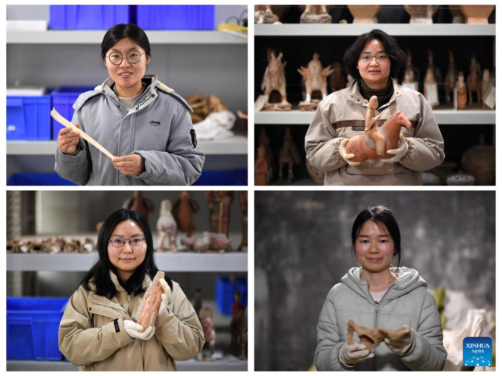 This combo photo taken on March 5, 2024 shows female archaeologists Wang Hongying (above, L), Wang Xiaojuan (above, R), Zhang Jiayang (below, L) and Guo Jie posing for photos in Xianyang in northwest China's Shaanxi Province. (Xinhua/Li Yibo)