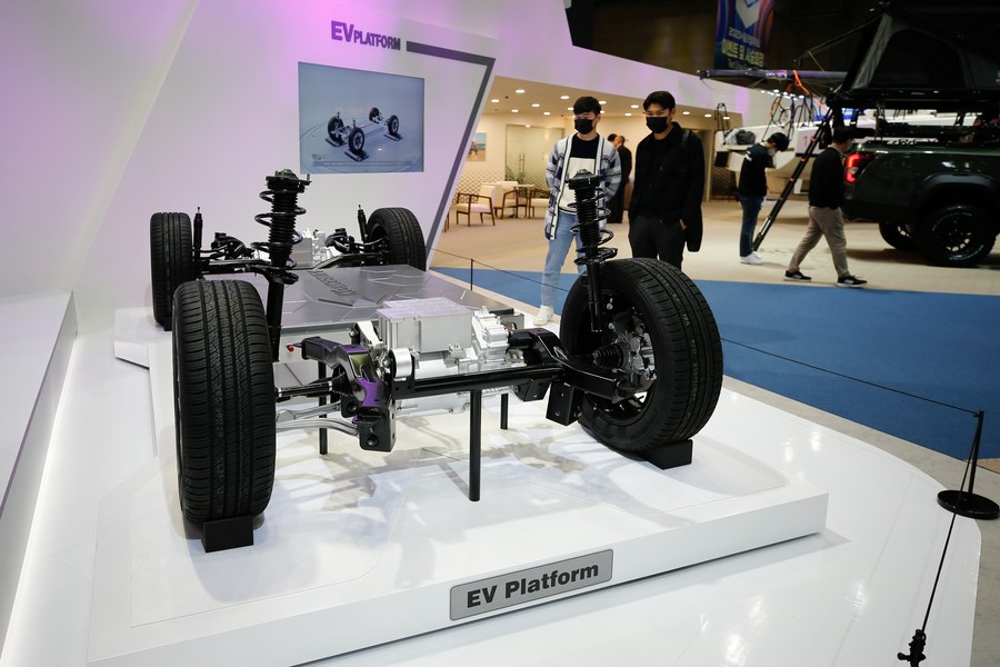 People watch an EV (electric vehicle) platform displayed during the Seoul Mobility Show at the KINTEX exhibition hall in Goyang, South Korea, March 31, 2023. (Xinhua/Wang Yiliang)