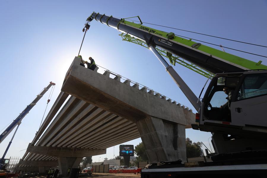 BAGHDAD, March 7 (Xinhua) -- In the Nisour Square at the heart of the Iraqi capital Baghdad, where the peak traffic flow reaches about 12,300 vehicles per hour, two cranes stretch their arms, hoisting precast beams weighing about 31 tonnes and measuring 30 meters onto mammoth bridge piers.