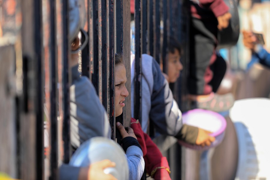 Palestinians wait for relief food supplies in the southern Gaza Strip city of Rafah, on Feb. 14, 2024. (Photo by Yasser Qudih/Xinhua)■