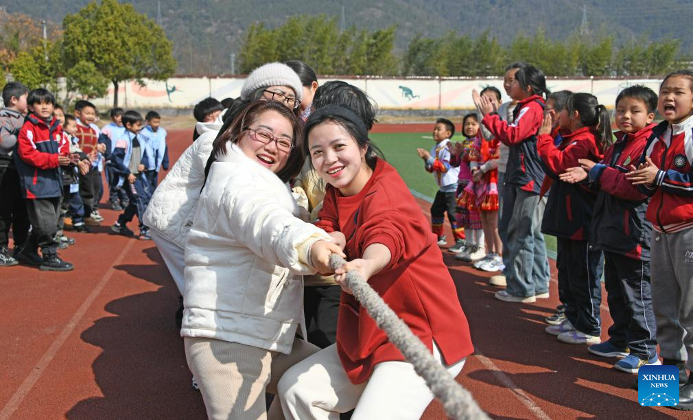 Teachers take part in a tug-of-war game at a primary school in Xianju County of Taizhou, east China's Zhejiang Province, March 8, 2024. Various activities were held across the country to celebrate International Women's Day. (Photo by Wang Huabin/Xinhua)