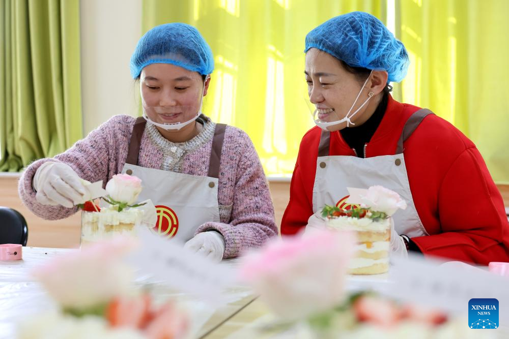 Staff members learn to make cakes in celebration of the International Women's Day in Shizhong District of Zaozhuang City, east China's Shandong Province, March 8, 2024. Various activities were held across the country to celebrate International Women's Day. (Photo by Sun Zhongzhe/Xinhua)