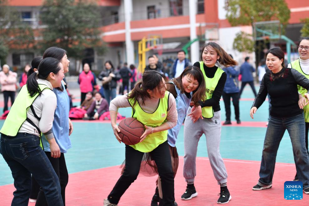 Teachers take part in a basketball game at a primary school in Huangping County of Qiandongnan Miao and Dong Autonomous Prefecture, southwest China's Guizhou Province, March 8, 2024. Various activities were held across the country to celebrate International Women's Day. (Photo by Liang Wen/Xinhua)