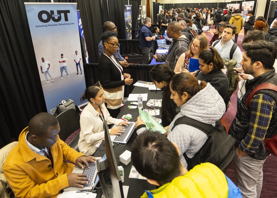 Job seekers attend a career fair in Toronto, Canada, on Feb. 29, 2024. (Photo by Zou Zheng/Xinhua)