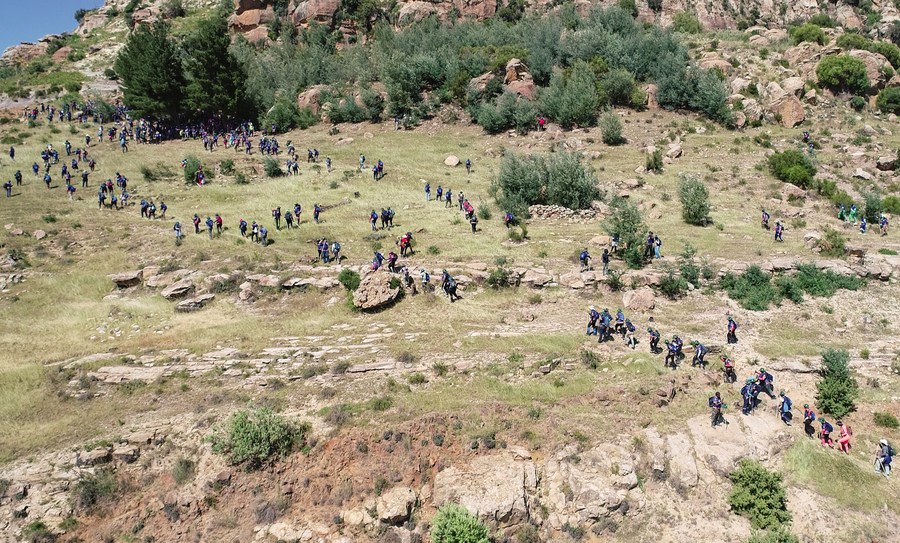 This aerial drone photo, taken on March 7, 2024, shows people participating in the Moshoeshoe Walk 2024 in Menkhoaneng, Lesotho. (Xinhua/Zhang Yudong)