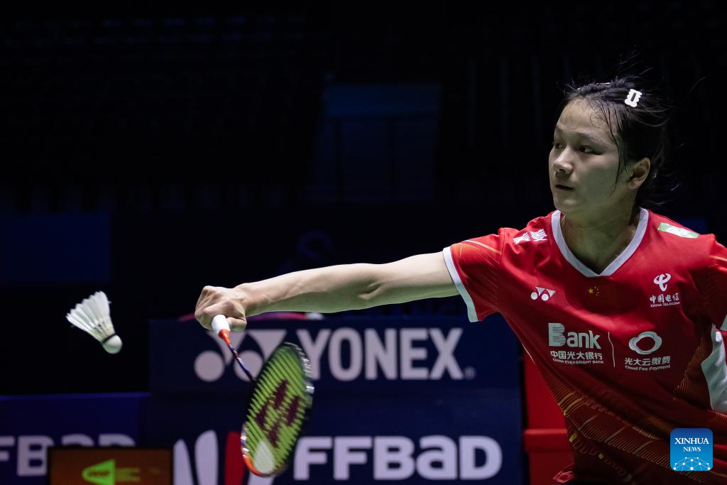 Zhang Yiman of China hits a return during the women's singles quarter-final against Yamagushi Akane of Japan at the Yonex French Open Badminton tournament in Paris, France, March 8, 2024. (Photo by Aurelien Morissard/Xinhua)