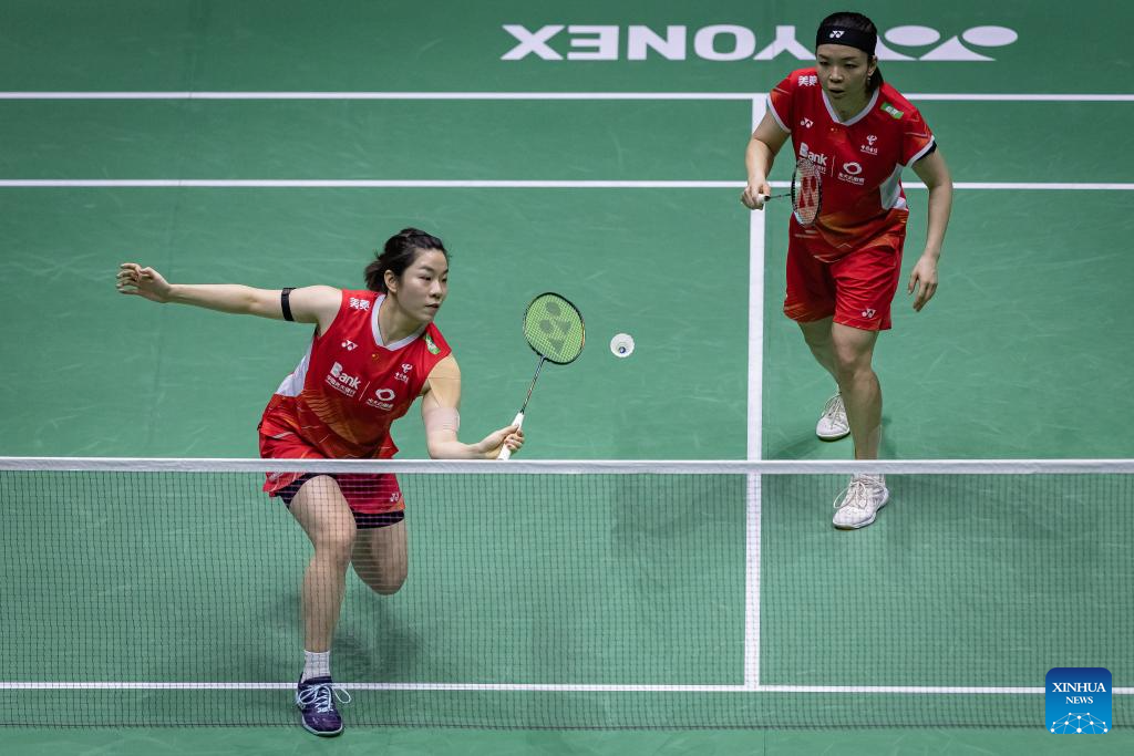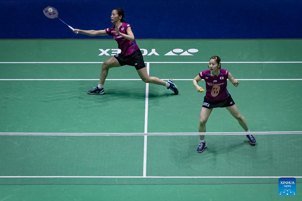 Matsuyama Nami (front)/Shida Chiharu of Japan compete during the women's double quarterfinal match between Matsuyama Nami/Shida Chiharu of Japan and Baek Ha Na/Lee So Hee of South Korea at French Open Badminton tournament in Paris, France, March 8, 2024. (Photo by Aurelien Morissard/Xinhua)