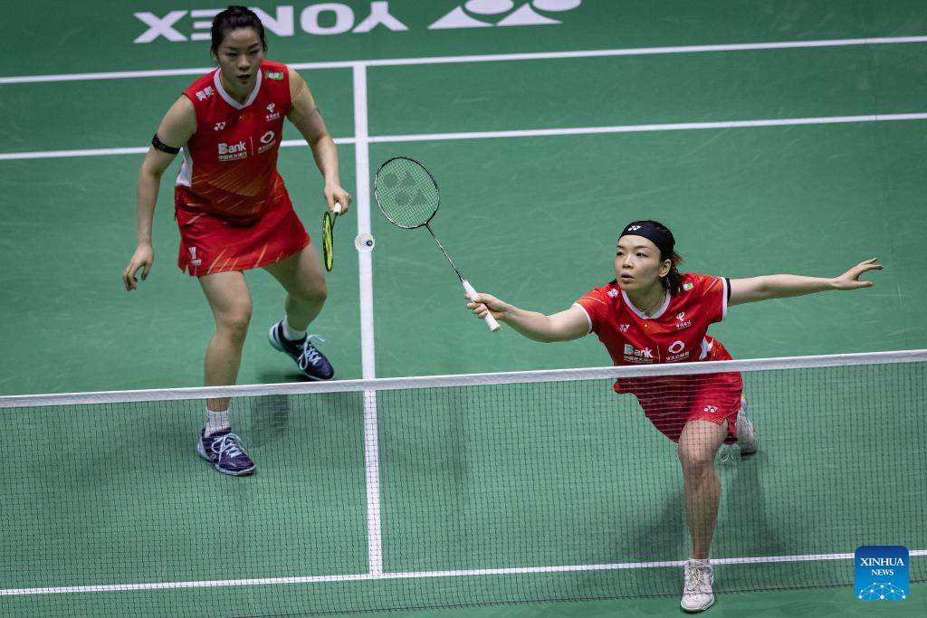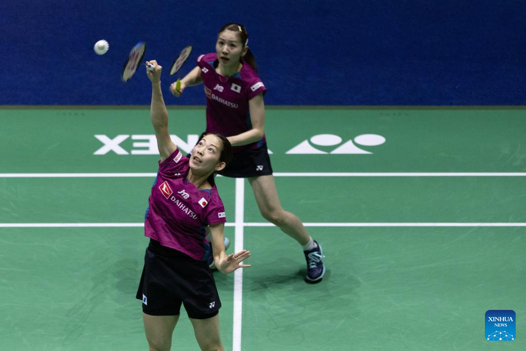 Matsuyama Nami (L)/Shida Chiharu of Japan compete during the women's double quarterfinal match between Matsuyama Nami/Shida Chiharu of Japan and Baek Ha Na/Lee So Hee of South Korea at French Open Badminton tournament in Paris, France, March 8, 2024. (Photo by Aurelien Morissard/Xinhua)