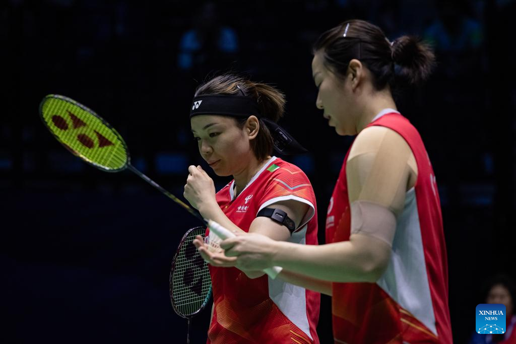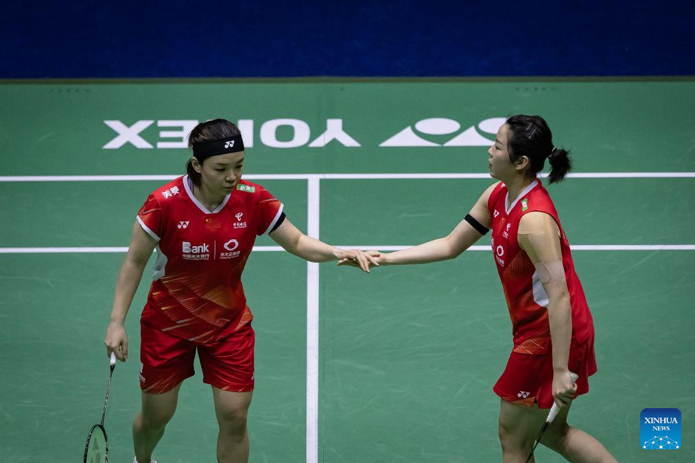 Chen Qingchen (L)/Jia Yifan react during the women's double quarterfinal match between Chen Qingchen/Jia Yifan of China and Treesa Jolly/Gayatri Gopichand Pullela of India at French Open Badminton tournament in Paris, France, March 8, 2024. (Photo by Aurelien Morissard/Xinhua)