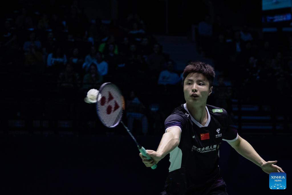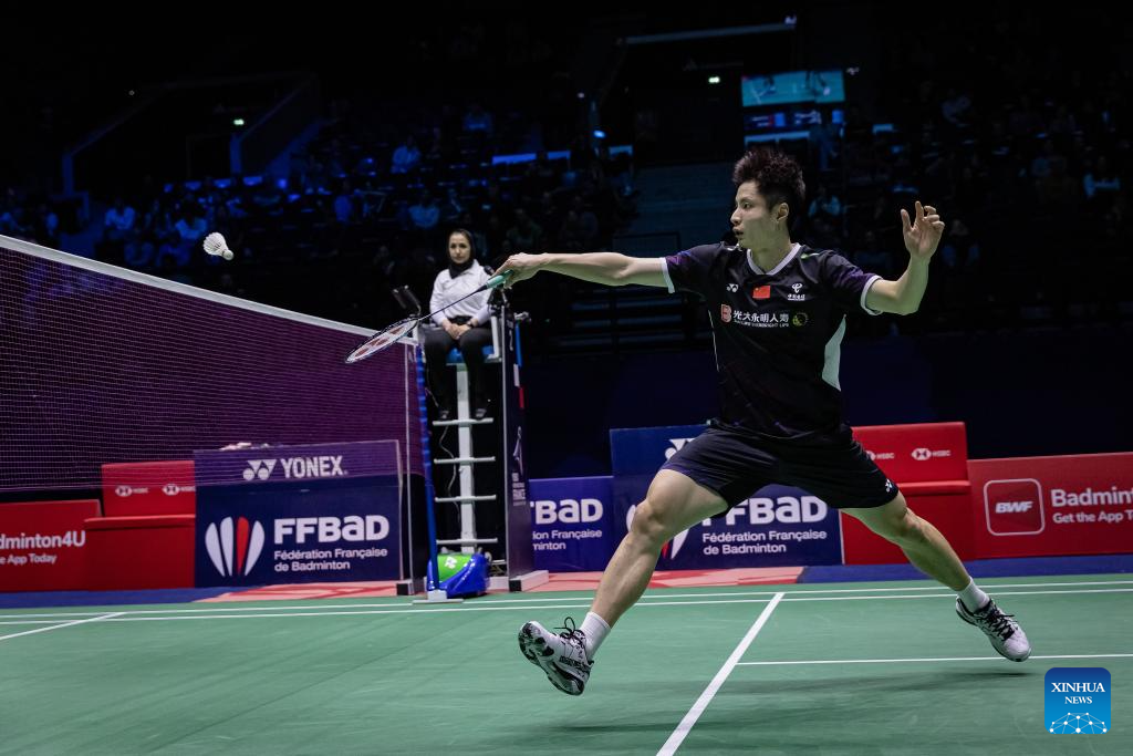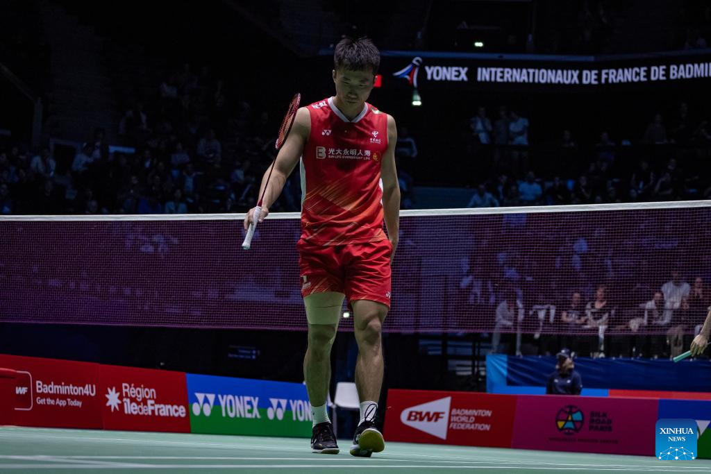 Shi Yuqi competes during the men's singles quarterfinal match between Shi Yuqi and Lu Guangzu of China at French Open Badminton tournament in Paris, France, March 8, 2024. (Photo by Aurelien Morissard/Xinhua)