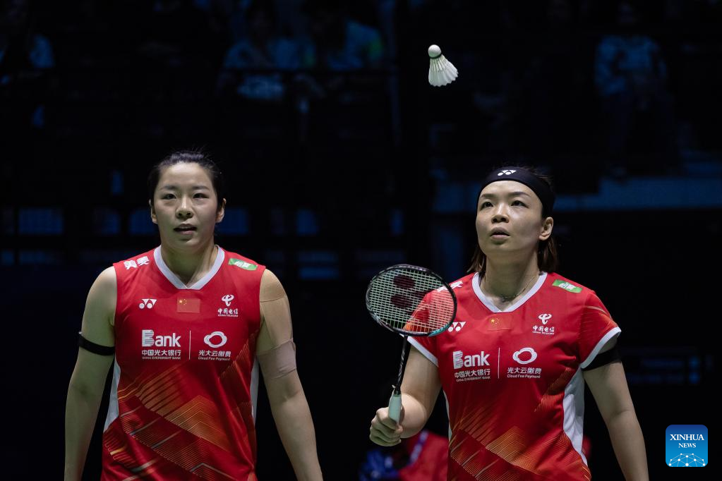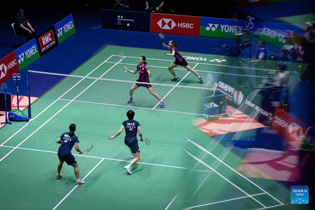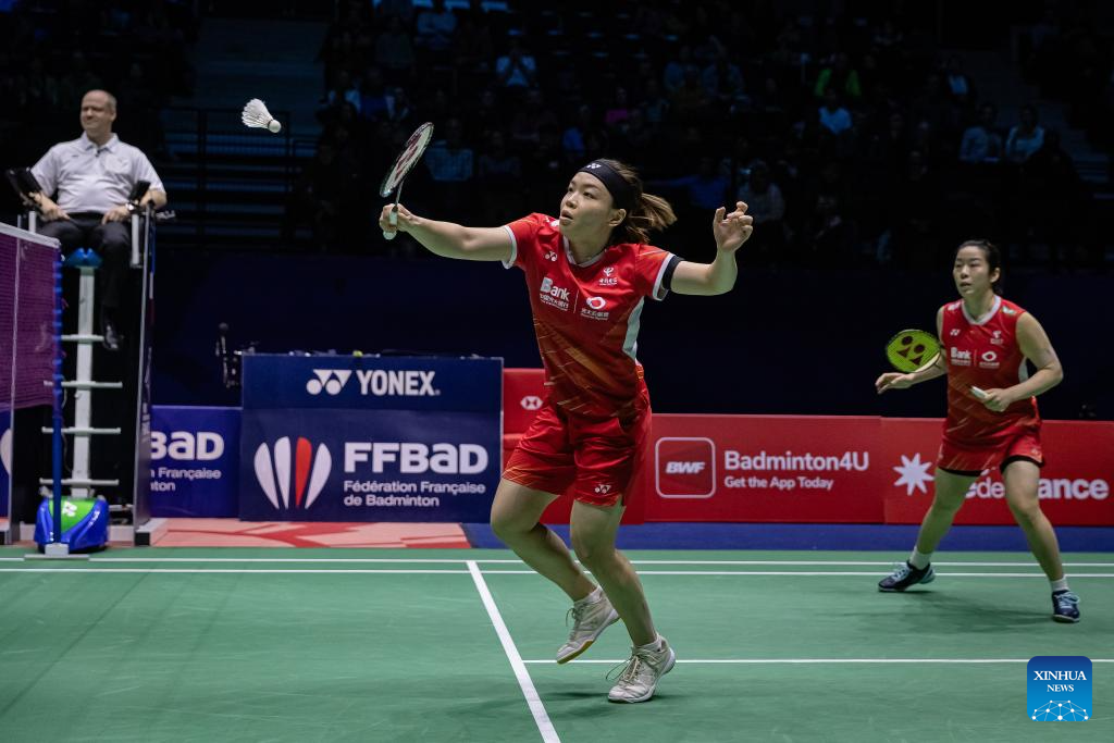 Chen Qingchen (R)/Jia Yifan compete during the women's double quarterfinal match between Chen Qingchen/Jia Yifan of China and Treesa Jolly/Gayatri Gopichand Pullela of India at French Open Badminton tournament in Paris, France, March 8, 2024. (Photo by Aurelien Morissard/Xinhua)