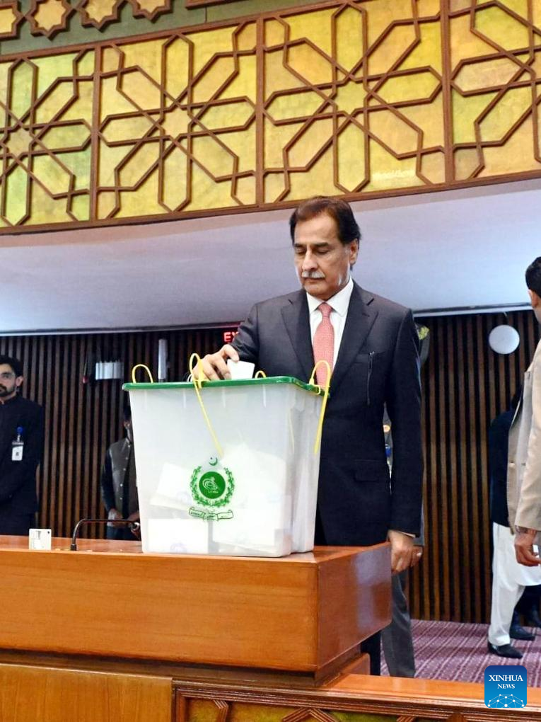 Photo released by Pakistan's Press Information Department (PID) on March 9, 2024 shows Sardar Ayaz Sadiq, speaker of the National Assembly, casting his vote during the presidential election in Islamabad, capital of Pakistan. Ruling coalition candidate Asif Ali Zardari won the presidential election of Pakistan with an overwhelming lead on Saturday, the Election Commission of Pakistan announced. (PID/Handout via Xinhua)