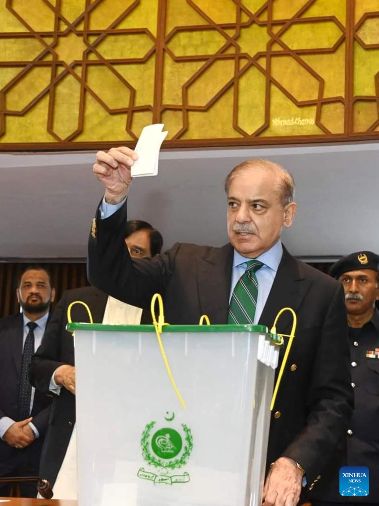 Photo released by Pakistan's Press Information Department (PID) on March 9, 2024 shows Prime Minister Shahbaz Sharif casting his vote during the presidential election in Islamabad, capital of Pakistan. Ruling coalition candidate Asif Ali Zardari won the presidential election of Pakistan with an overwhelming lead on Saturday, the Election Commission of Pakistan announced. (PID/Handout via Xinhua)
