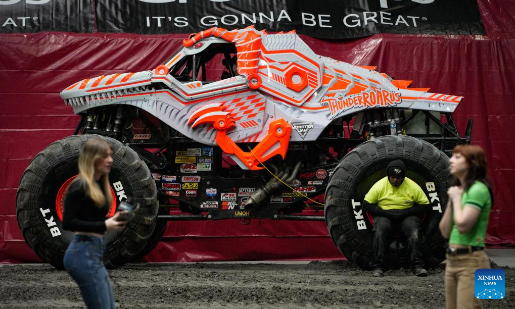 People view a monster truck during a media preview of Monster Jam in Vancouver, British Columbia, Canada, on March 8, 2024. (Photo by Liang Sen/Xinhua)