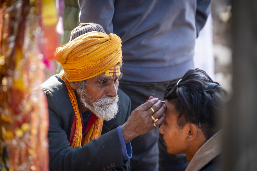 A devotee receives tika during the Maha Shivaratri festival on the premises of Pashupatinath Temple in Kathmandu, Nepal, March 8, 2024. (Photo by Hari Maharjan/Xinhua)