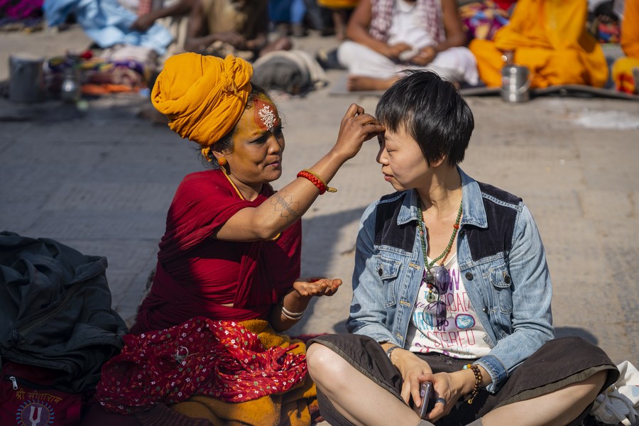 A holy woman puts tika on the forehead of a foreigner on the premises of Pashupatinath Temple during the Maha Shivaratri festival in Kathmandu, Nepal, March 8, 2024. (Photo by Hari Maharjan/Xinhua)■