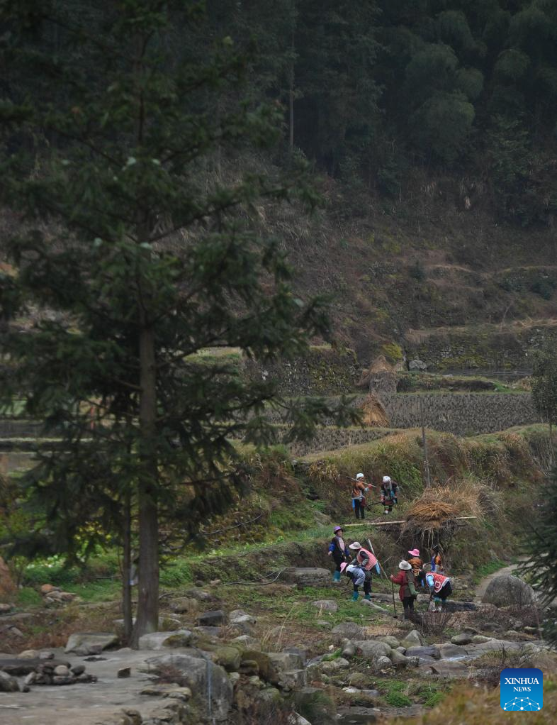 Children walk in the field with saplings in Wuying Village on the border between south China's Guangxi Zhuang Autonomous Region and southwest China's Guizhou Province, March 20, 2019. Wuying Village is a Miao ethnic group hamlet that nestles snugly in the towering mountains stretching across the border between Guangxi and Guizhou.
