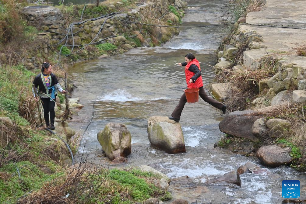 Female villagers collect saplings and prepare for planting in Wuying Village on the border between south China's Guangxi Zhuang Autonomous Region and southwest China's Guizhou Province, March 9, 2024. Wuying Village is a Miao ethnic group hamlet that nestles snugly in the towering mountains stretching across the border between Guangxi and Guizhou.