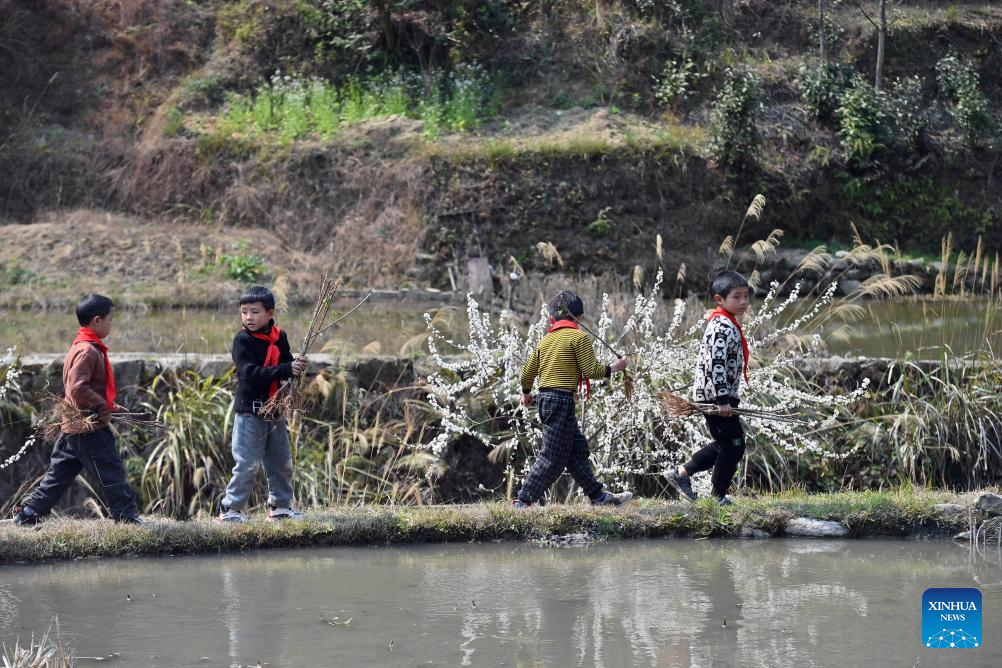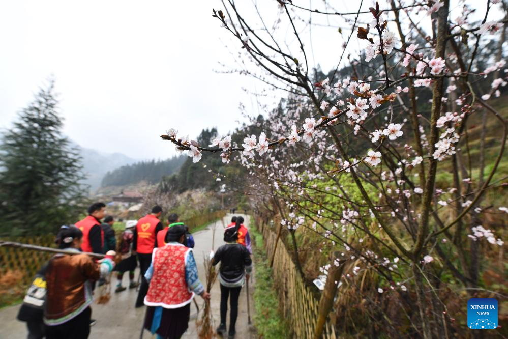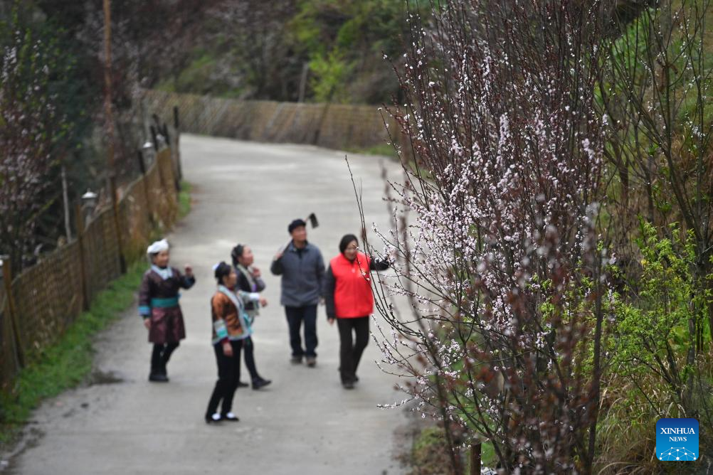Villagers and volunteers view flowers after planting trees in Wuying Village on the border between south China's Guangxi Zhuang Autonomous Region and southwest China's Guizhou Province, March 9, 2024. Wuying Village is a Miao ethnic group hamlet that nestles snugly in the towering mountains stretching across the border between Guangxi and Guizhou.